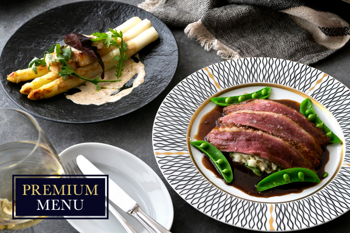 【2周年記念】ホワイトアスパラとホタテのポワレ アンチョビクリーム&マグレカナールのスパイシーロースト グリーンマスタードソース(1キット2人前)