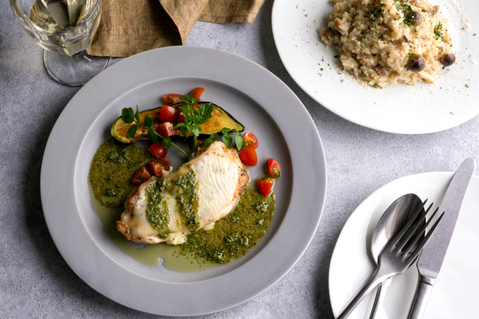 チーズをのせた鶏もも肉ソテー〜ジェノベーゼソース〜&ポルチーニのリゾット(1キット2人前)