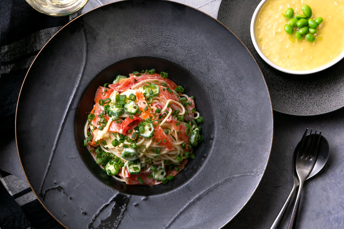 スモークサーモンとオクラ、ミニトマトの冷製クリームパスタ&枝豆のフラン コンソメのジュレ(1キット2人前)