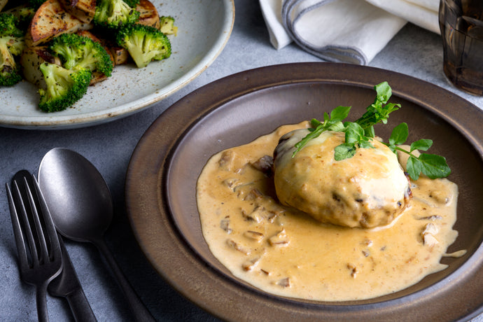 チーズハンバーグ〜ポルチーニクリームソース〜&ブロッコリーとポテトのアンチョビバジルソテー(1キット2人前)