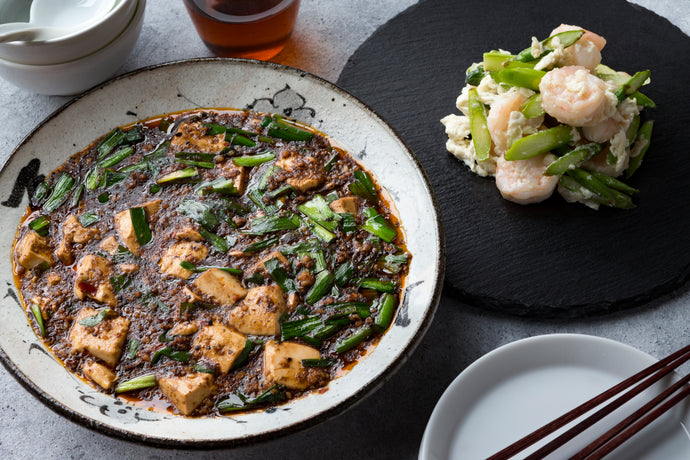 ニラのたっぷり入った本格麻婆豆腐&アスパラガスと海老の卵白炒め(1キット2人前)