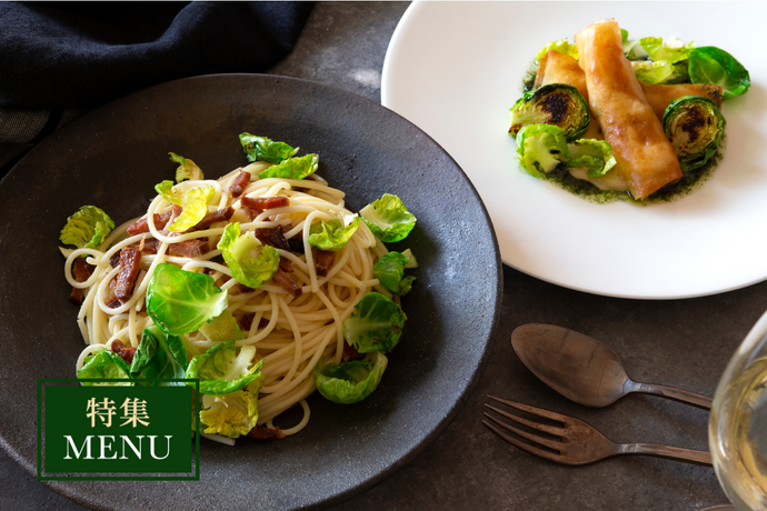 パンチェッタと芽キャベツのアーリオオーリオ&海老のパート巻き アンチョビクリームとパセリオイル