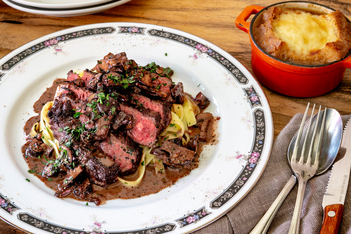 ハラミのステーキ キノコのクリームソース パスタ添え&牛すじのオニオングラタンスープ風(1キット2人前)