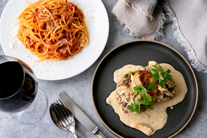 イノシシの煮込みハンバーグ フォアグラ添え&アマトリチャーナパスタ(1キット2人前)