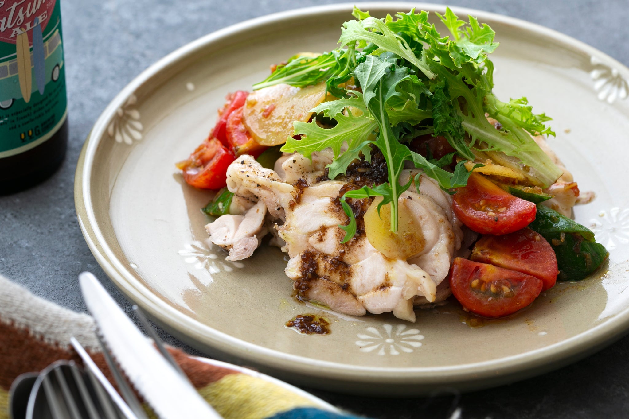 柔らかくジューシーな美桜鶏もも肉に、カレーの香りが食欲をそそります。バルサミコの酸味で、暑い日でもサッパリと食べやすい仕上がりに。お好みでパクチーを乗せてお召し上がりください。