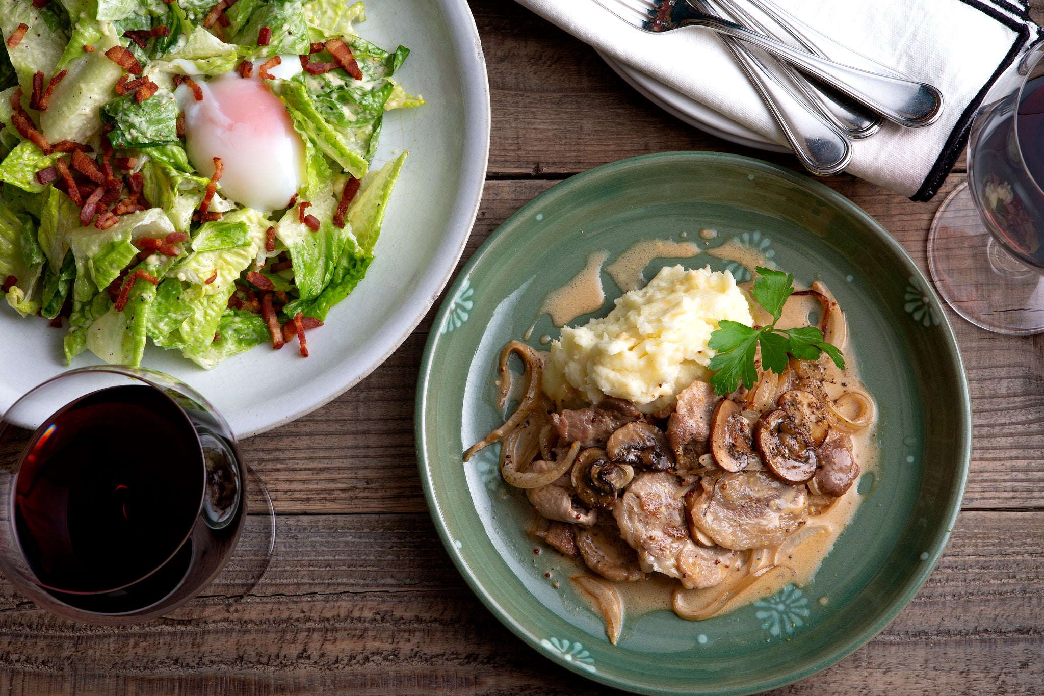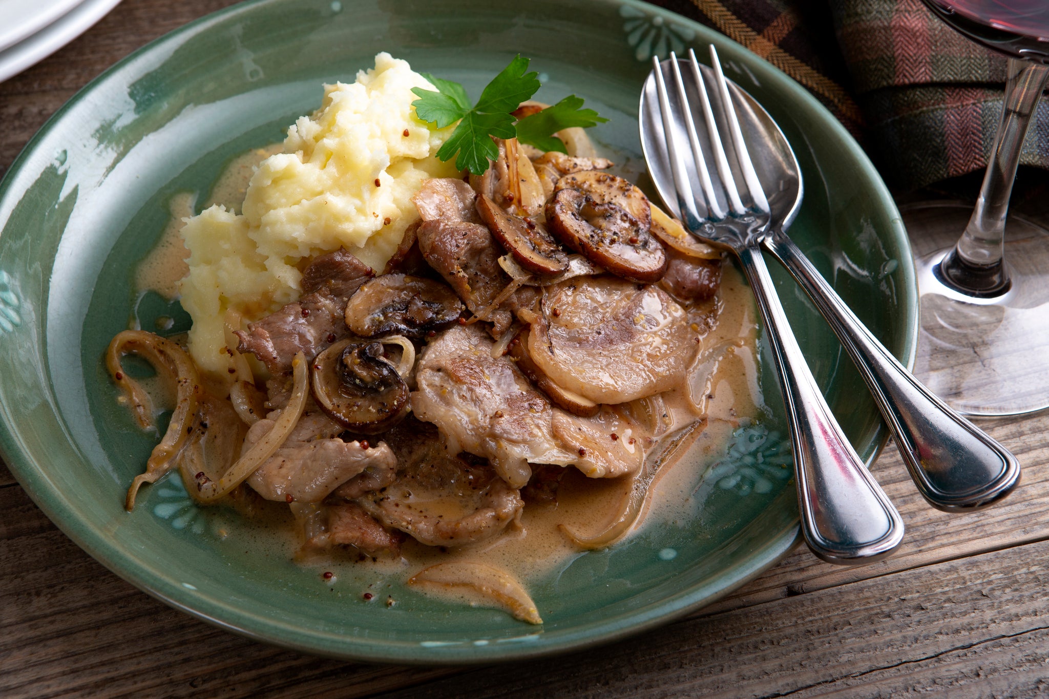 簡単なフライパン1つの調理で、豚肉をビストロ料理に仕上げるレシピのご紹介です。 まろやかなクリームソースは粒マスタードの酸味と玉ねぎの甘さ、きのこの風味で奥深い味わいに。 付け合わせのマッシュポテトもソースをよく含むので、最後まで飽くことなくお楽しみいただけます。